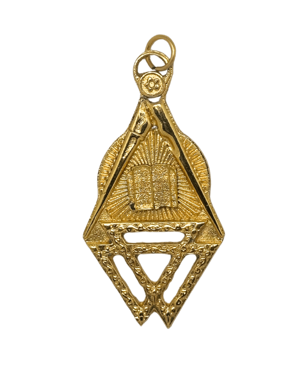 Magnifique Bijou de Troisième Grand Principal en airain représentant un Livre ouvert rayonnant encadrée d’un Compas et surmontant trois Triangles entrelacés.
