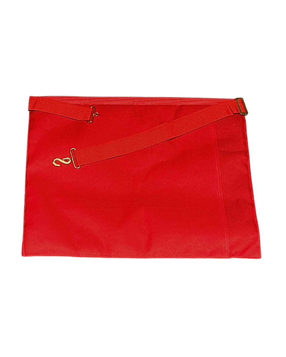 Ce magnifique tablier maçonnique brodé à la main est décoré du triangle avec le triple Tau sur fond rouge et de deux Pendeloques de couleur or.