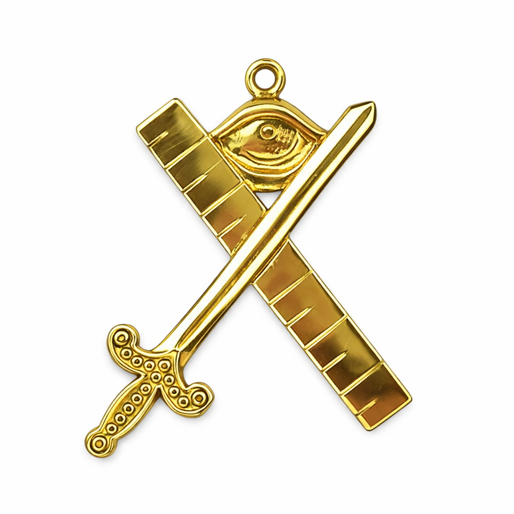 Magnifique bijou de l'Expert qui a en charge le bon déroulement de la tenue et le respect du rite, d’où le symbole de l’œil qui surmonte la règle et le glaive.