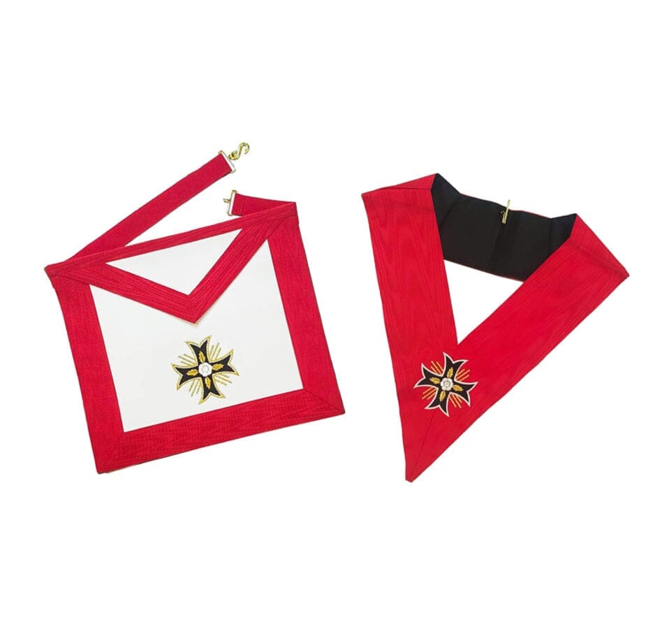 Ensemble comprenant le tablier et le sautoir de Chevalier Rose-Croix, 18° degré Memphis-Misraïm. Le tablier et le sautoir sont ornés d’une Croix Ancrée.