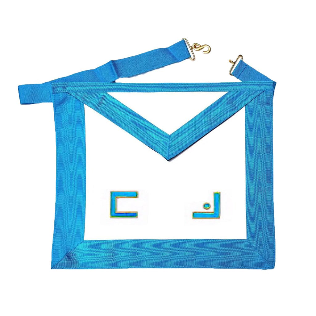 Ce magnifique tablier maçonnique en simili cuir et brodé à la main est décoré d'une bordure en ruban bleu turquoise et des lettres M:. B:. en alphabet maçonnique.