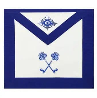 Ce magnifique tablier maçonnique de Trésorier, brodé à la main et bordé de bleu outremer, est orné de l’œil et des deux clés croisées.