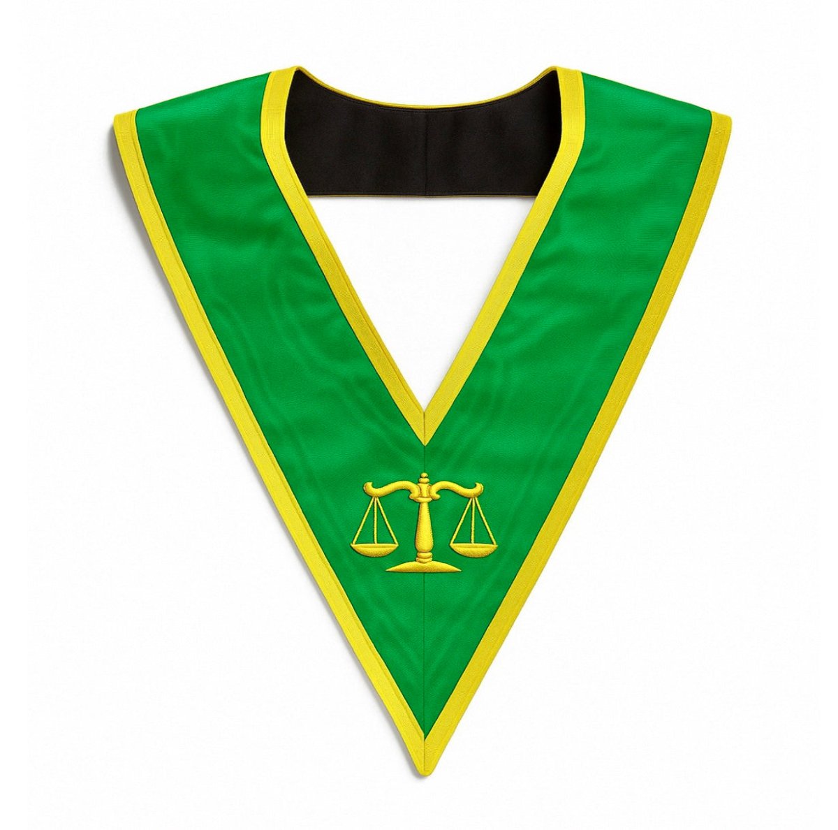 Wunderschönes Freimaurer-Springtuch eines Mitglieds der Oberste Kammer der Justiz des Grand Orient de France (GODF). Dieser Sautoir ist besteht aus einem grünes Moiré-Band mit gelbem Rand. Es ist mit einer Waage und gefüttert mit schwarz mit Trauerdruck.