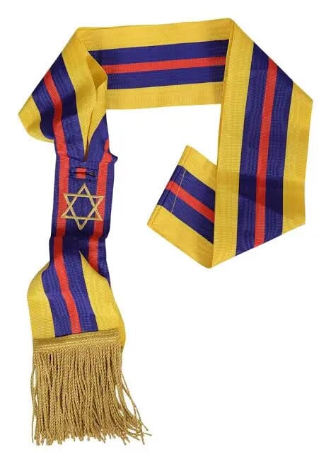 Wunderschöne Schal oder Schultergurt eines Gesellen, von Die Farbe ist gelb, violett und rot, mit Goldfransen, und mit einer Goldener Davidstern, in einem Hochwertige Ausführung.
