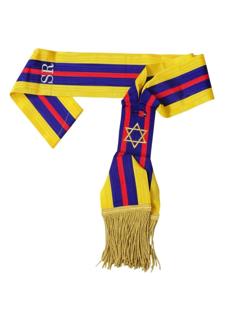 Wunderschöne Schal oder Schulterriemen des Gouverneurs (Supreme Ruler), von Die Farbe ist gelb, violett und rot, mit Goldfransen, geschmückt mit einer Goldener Davidstern und den Buchstaben SR, in einer hochwertige Ausführung