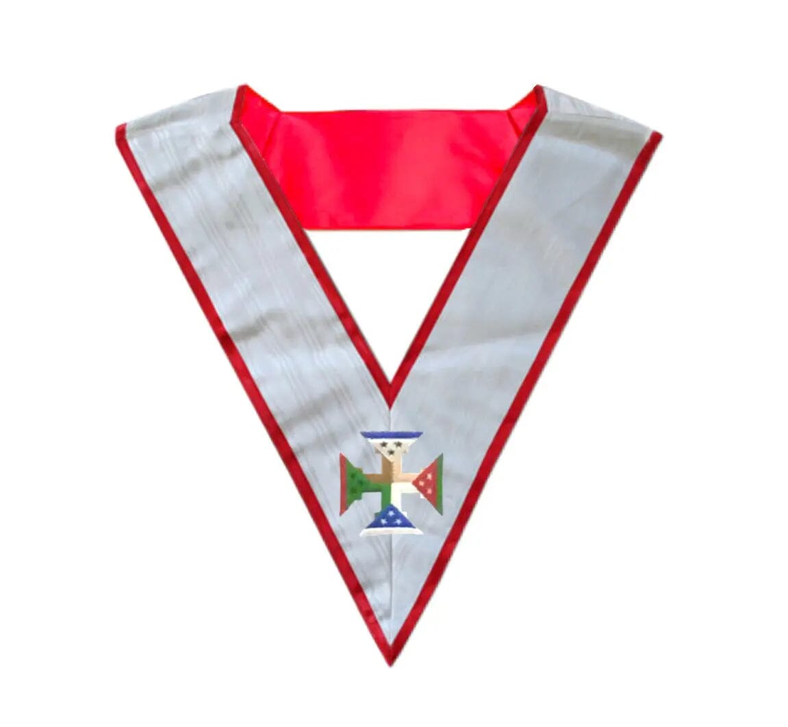 Wunderschöne Sautoir des 20.° Grad GOE in Naturseide weiß mit roter Borte und Verzierungen mit dem Kreuz des Grades, in einem Hochwertige Ausführung. Der rote Rücken ist gefüttert für einen besseren Komfort.