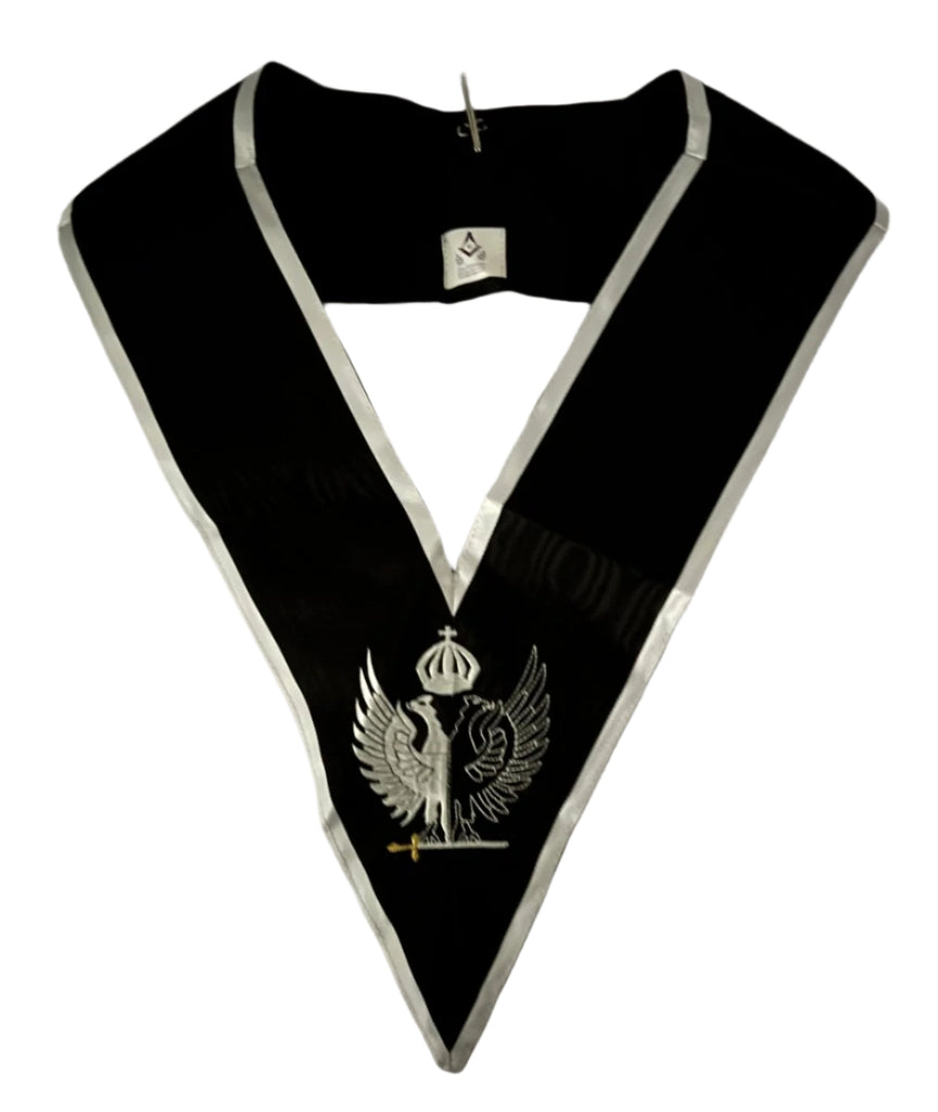 Wunderschönes Sautoir von Dreimal Mächtiger Meister, Präsident des 14° Grad REAA in Naturseide in blauer Farbe, goldfarbener Rand und ist mit zwei Stickereien verziert, die Folgendes darstellen der fünfzackige Stern und einen großen Akazienzweigin einem hochwertiges Finish. Der schwarze Rücken ist gefüttert für einen besseren Komfort.
