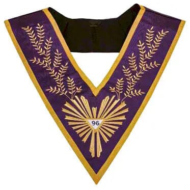 Wunderschön Sautoir von 96° GradFarbe violett mit goldenem Rand, verziert mit einer Große Herrlichkeit mit der Zahl 96 und mit große Akazienzweigen.