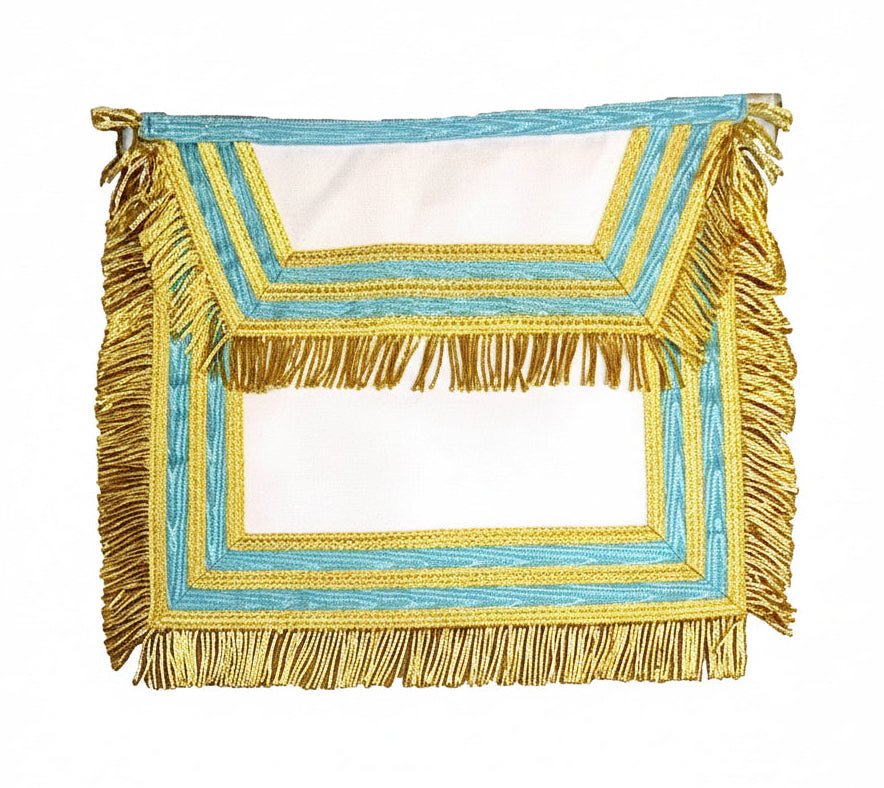 Dieser wunderschöne Schurz der Großloge mit trapezförmigem Latz ist mit einem hellblauen Band mit dreifacher Goldborte und goldenen Fransen verziert.