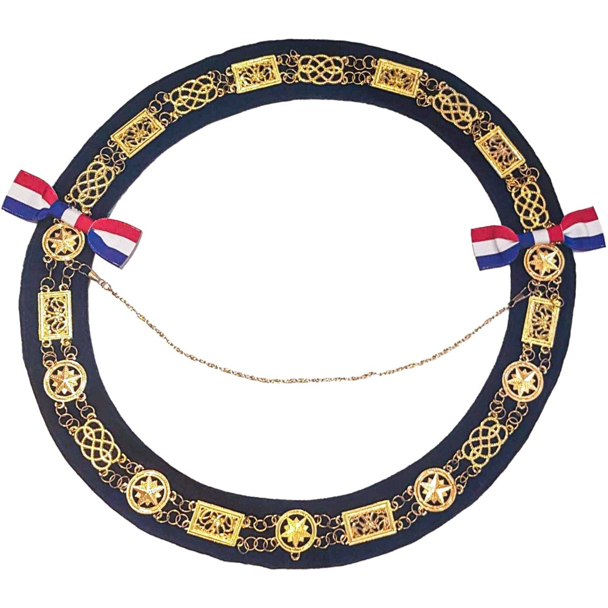 Halskette des Grand Officier National de Luxe, mit den Seen der Liebe und den Buchstaben der Obedience in Bronze auf einem blauer Untergrund und ein Rückseite aus Samt (rutschfest). Die Schleifen auf den Schultern können individuell gestaltet werden an Nationalfarben. Standardmäßig werden sie dunkelblau.