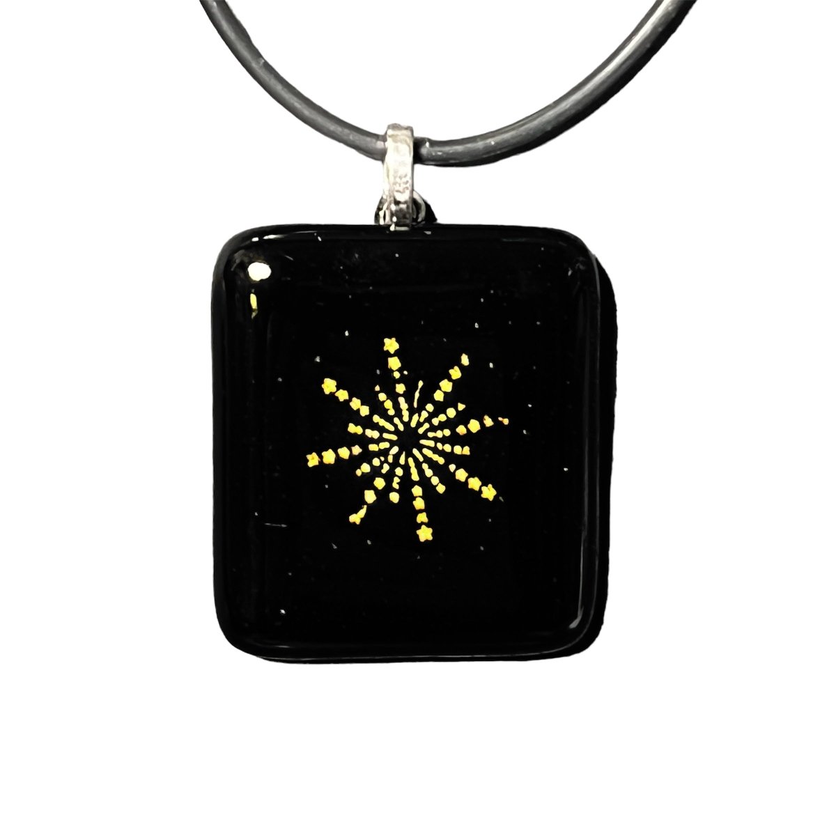 - Ein quadratischer AnhängerEin schwarzer Anhänger aus Fusionsglas mit einem goldenen Sonnenmotiv.