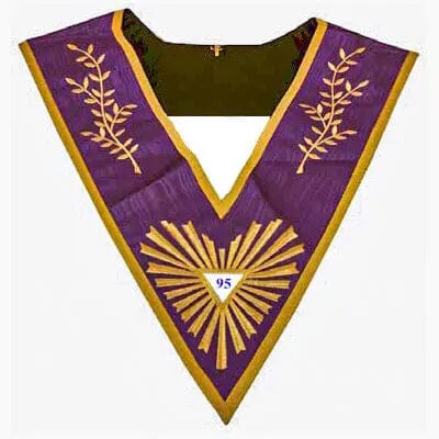 Wunderschön Sautoir von 95° GradFarbe violett mit goldenem Rand, verziert mit einer Große Herrlichkeit mit der Zahl 95 und mit Akazienzweigen.