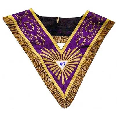 Wunderschönes Sautoir aus 97° des Ordens der Vereinigten Riten von Memphis & Misraïmaus Samt violett Einfassung Gold, mit einem Goldfransen und gefüttert mit schwarz. Er ist verziert mit Stickereien und einer Ruhm mit der Zahl 97.