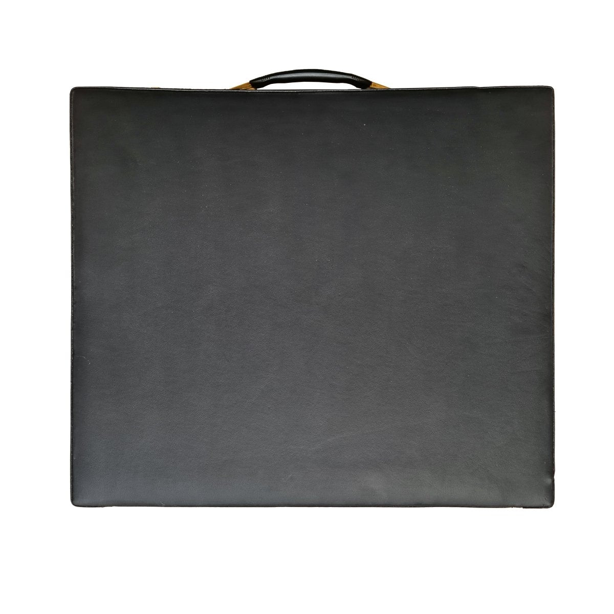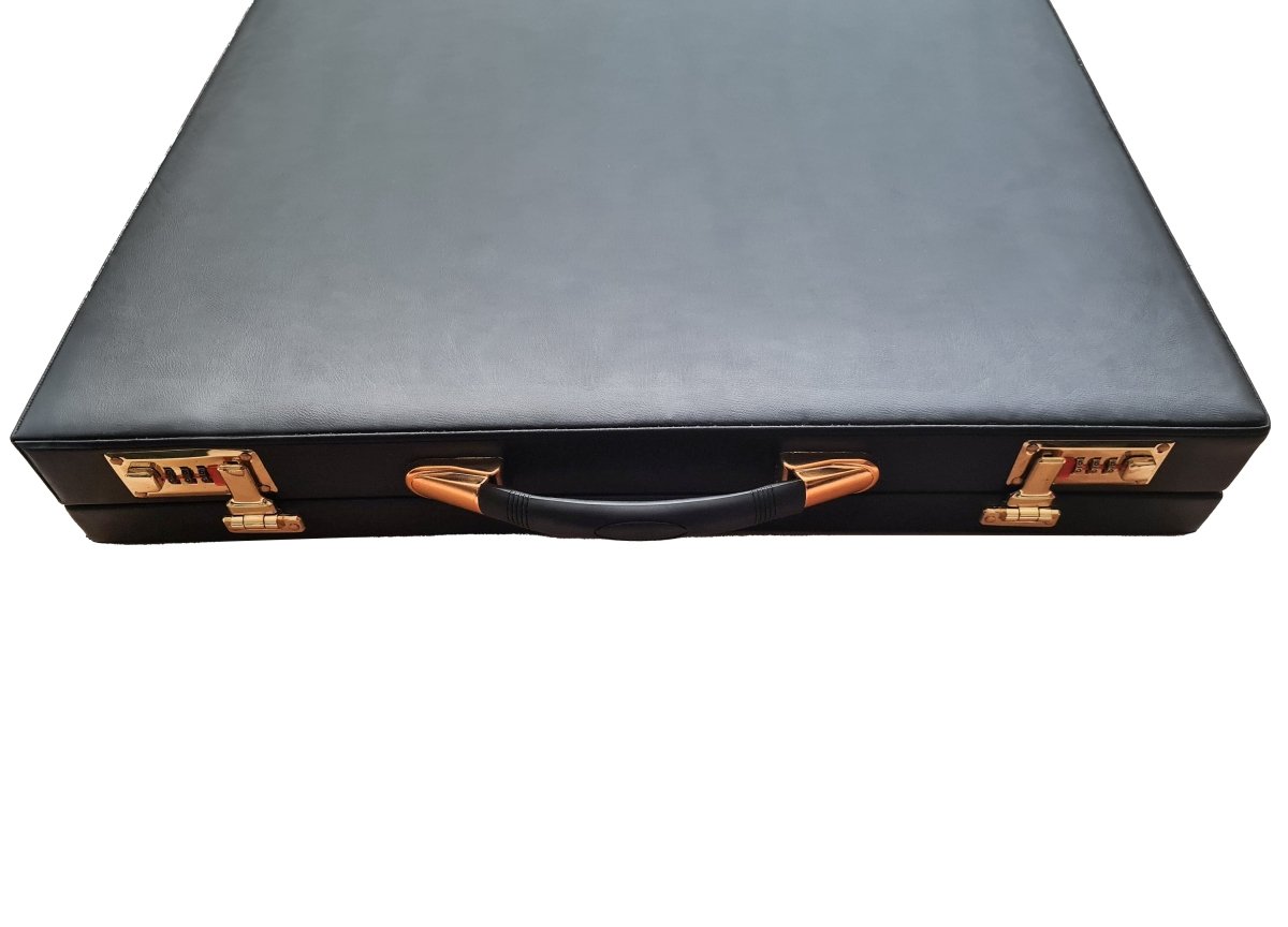 Hartschalenkoffer aus Kunstleder mit blauem Innenfutter.