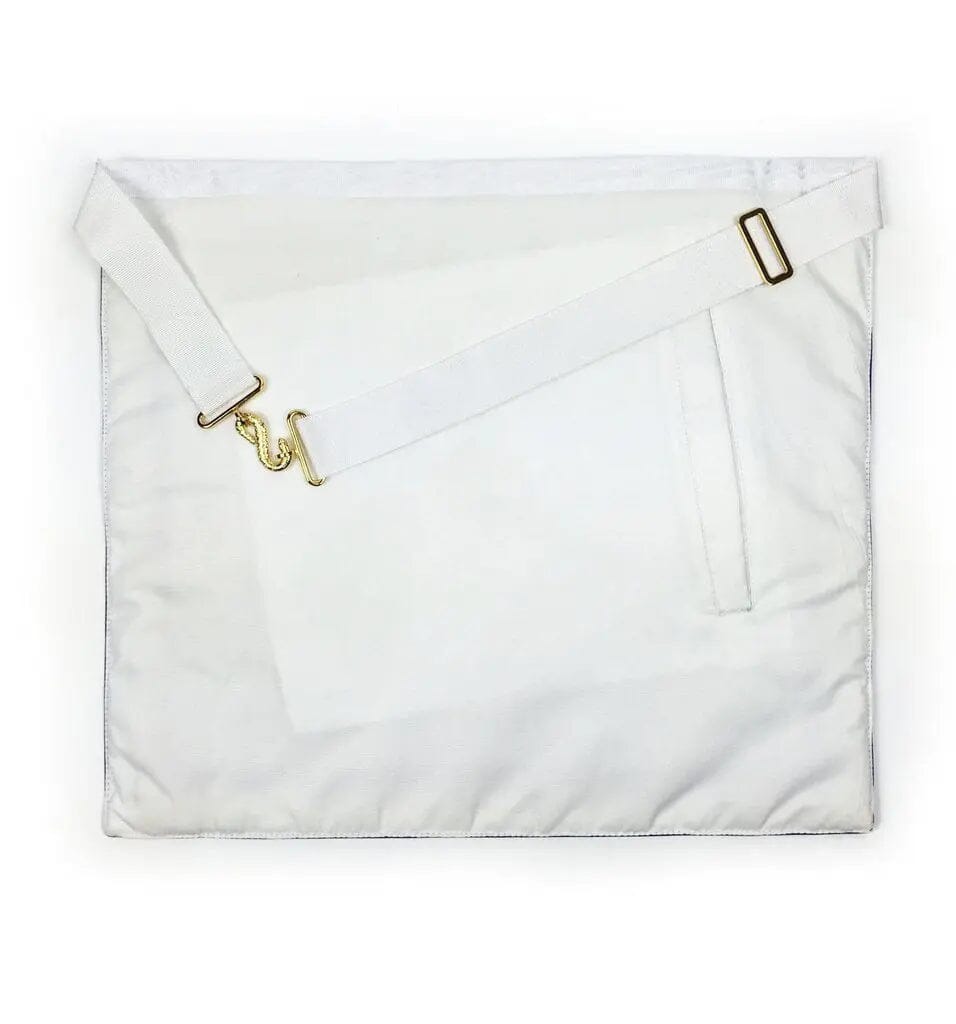 Dieser wunderschöne, handbestickte Freimaurer-Schurz ist mit dem Dreieck mit dem dreifachen Tau und zwei goldfarbenen Pendeloques verziert.