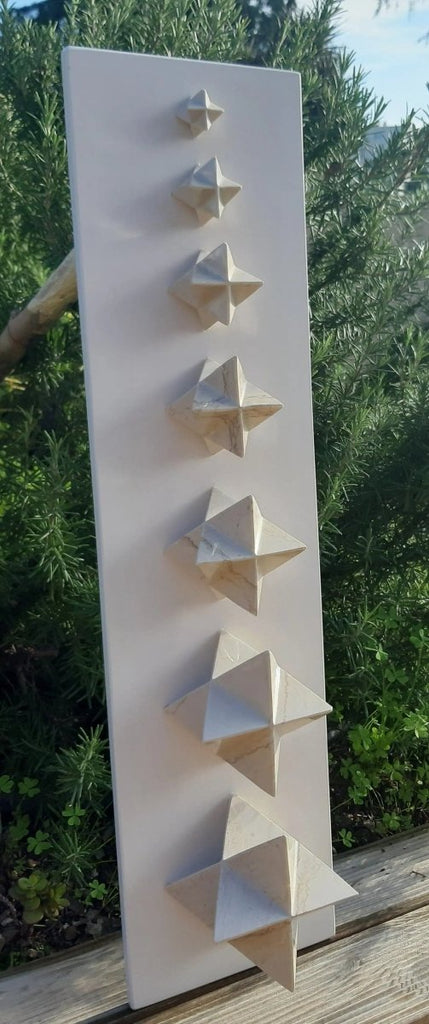 - Eine Skulptur "7er-Brett Merkabah" aus beigem Kalkstein in einer Größe von 8cm bis 2cm.