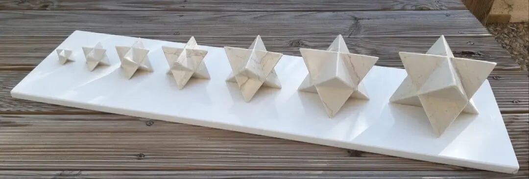 Skulptur "Brett mit 7 Merkabahs" aus beigem Kalkstein, 8 cm bis 2 cm groß.