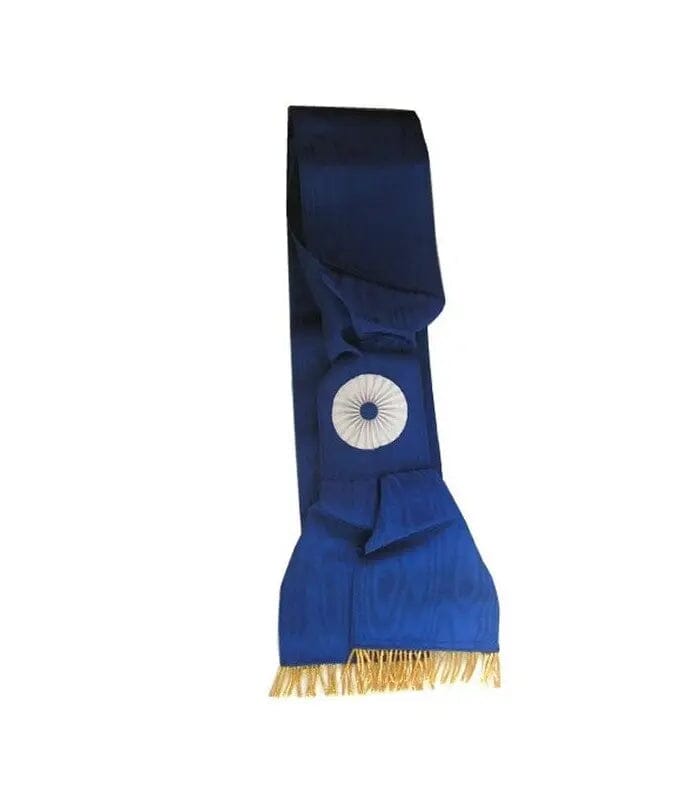 Wunderschöner Schal von Meister Gezüchtet in ultramarinblaue Naturseidemit einer Rosette und einem weißen Fransen mit goldenen Streifen. Sie ist schwarz gefüttert oder blau.
