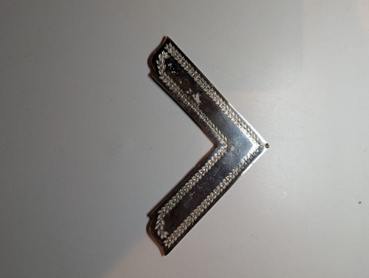 Winkel Freimaurer aus vergoldetes Metall. Zusammen mit dem Zirkel wird er auf dem Tablett des Ehrwürdigen Meisters platziert. Sie wird bei den Aufnahmezeremonien der verschiedenen Freimaurergrade verwendet.