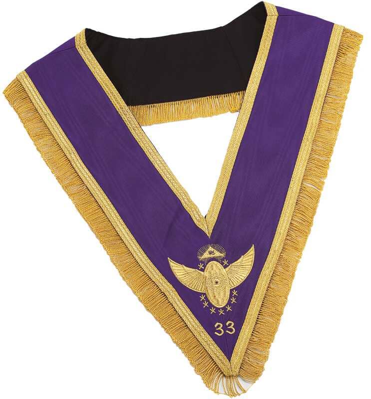 Wunderschöne Sautoir von Großer Offizier GOE in Naturseide violett mit Goldrand, verziert mit dem Symbol des 33. 33 und der Zahl goldenen Fransen, in einer hochwertiges Finish. Der Rücken ist gefüttert schwarz für einen besseren Komfort.
