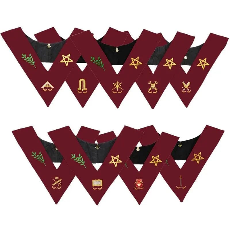Wunderschön Set aus 9 Sautoirs d'Officiers des 4° REAA in Naturseide von blaue Farbe mit schwarzer Rand und verziert die gestickte Amtsinsignie und mit Akazienzweige. Sie sind mit schwarz für einen besseren Komfort.