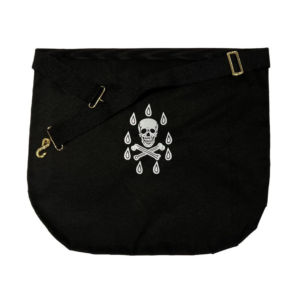Dieser wunderschöne, handbestickte Freimaurer-Schurz hat einen schwarzen Latz, der mit drei roten Flammen eingefasst und verziert ist. Der Körper der Schürze ist mit einem Dolch verziert, der von neun roten Flammen umgeben ist.