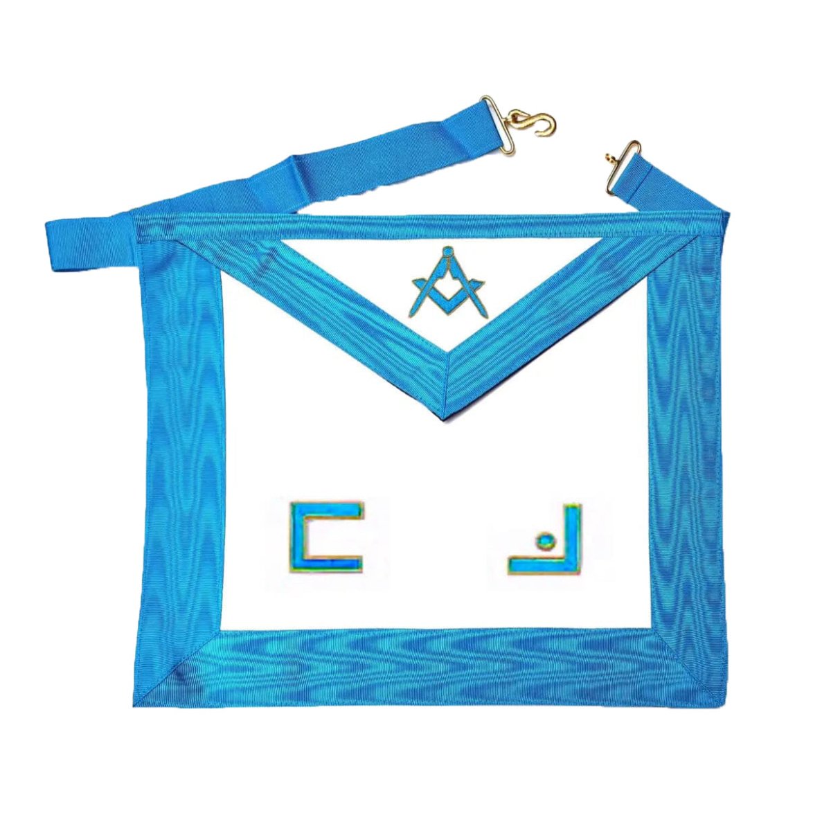 Diese wunderschöne Freimaurerschürze Die handbestickte Schürze ist mit einem Muster verziert. Bordüre aus türkisblau, des Buchstaben M:. B:. in freimaurerischem Alphabet und dem Winkelmaß und des Zirkel.