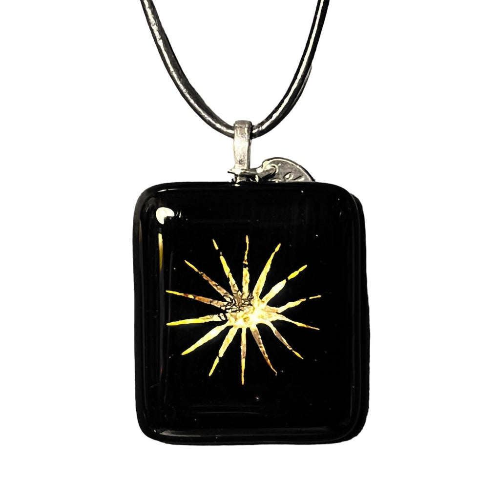 - Un pendentif carré noir en verre fusionné avec motif soleil doré.