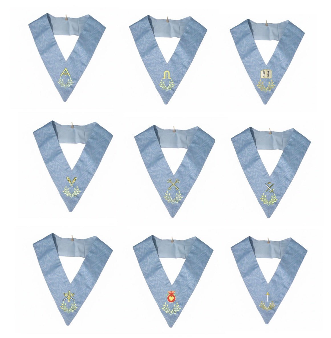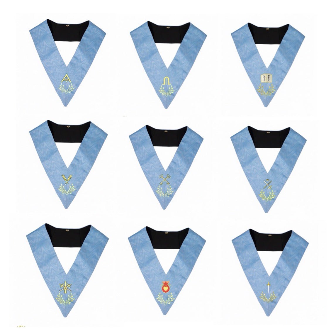 Set 9 Lodge Officers Collars. Embroidered. Natural Silk - French Rite "Traditional" and " Modern"
