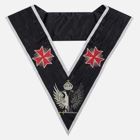 Impresionante collar largo Tres poderosos Gran Maestro En 30° Memphis-Misraïm Grado está en seda natural Negro y decorado en color de Dos cruces templarios rojos Y de El águila de dos cabezas.