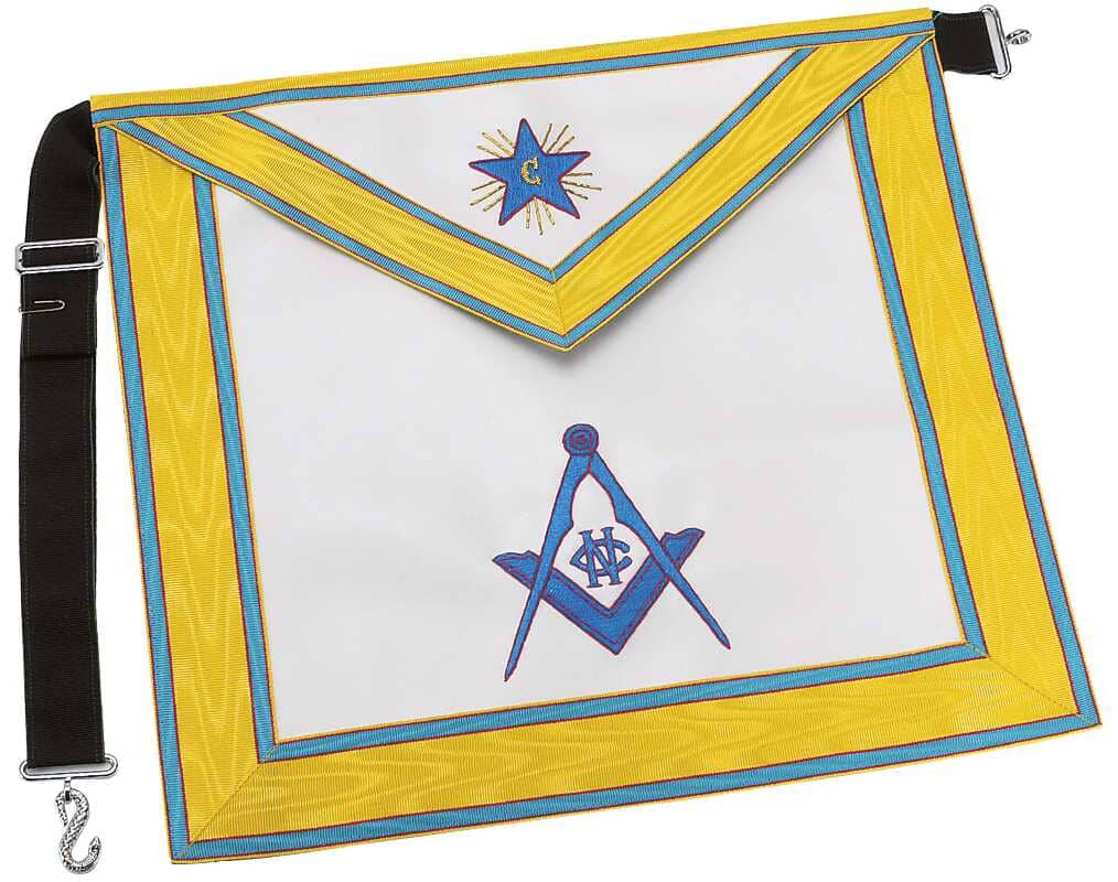 Magnífico delantal masónico de Asesor nacional del derecho humano (DH). Este delantal es blanco, bordeado por un cinta amarilla, él mismo bordeado por un End la cinta en el color de la reaa (borde azul con rojo). Bordado en azul en el delantal son el cuadrado y la brújula de supervisor Letras CN entrelazado y en el babero La estrella extravagante con la carta GRAMO.