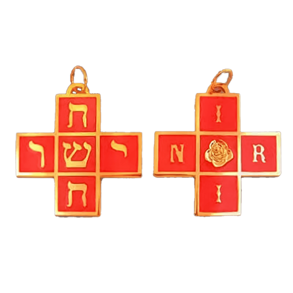 Espléndido Joya de Athirsata muy sabia (TSA), Presidente de la reaa de 18 ° de grado, llevando a cabo una cara la Cartas I.N.R.I. rodeando un Rosa, y en el otro les letras hebreas יzosatal.