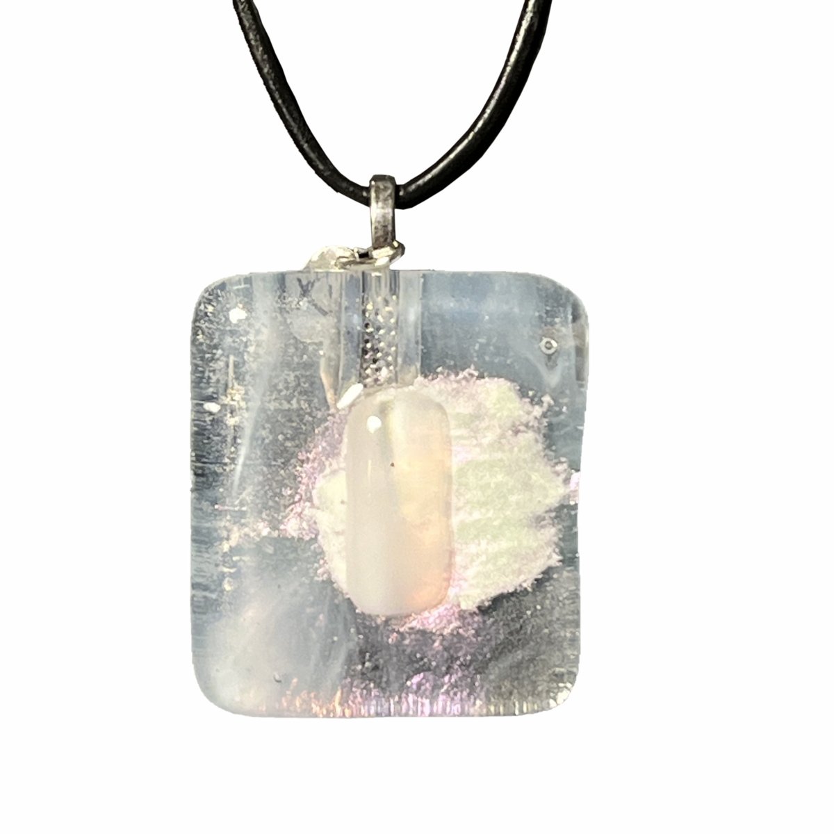 - Un colgante translúcido y cromo de vidrio fusionado.