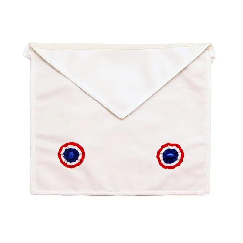 Este Magnífico delantal masónico de Compañero bordado a mano está decorado con un borde de cinta blanca y Dos rosetas tricolores. Las rosetas son Rigidificado y montado en soporte Para mantener pliegues regulares y perfectos en todas las situaciones.