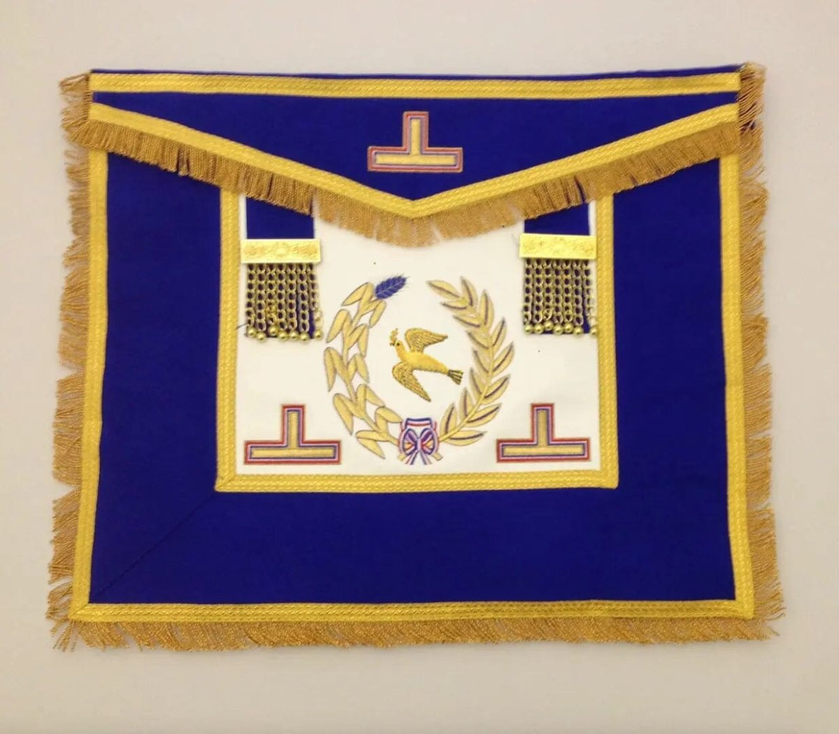 Este Magnífico delantal masónico en Piel genuina bordado a mano está decorado con 3 Taus y 2 colgantes, con un Rama de Acacia, del orejas de trigo, y Bonas doradas. En su centro está bordado el emblema de la función.