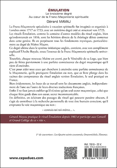 Este título final en el sistema de iniciación inglés contiene, con su complemento explicativo del Arca Real, toda la esencia de la masonería espiritual universal. Sin embargo, cada nuevo maestro es advertido, por venerable de su Logia, que muy pocos hermanos llegan a un conocimiento perfecto del título masónico que acaba de lograr. Es para ayudar a todos aquellos que buscan alcanzar este conocimiento perfecto de la mampostería, ya sea que practican la emulación o no, que este libro se sumerja en las raíces de los componentes de la emulación de la versión ritual inglesa, el único practicado en Francia. Obviamente, los conceptos básicos de este trabajo son los documentos en inglés, independientemente de uno u otro de
