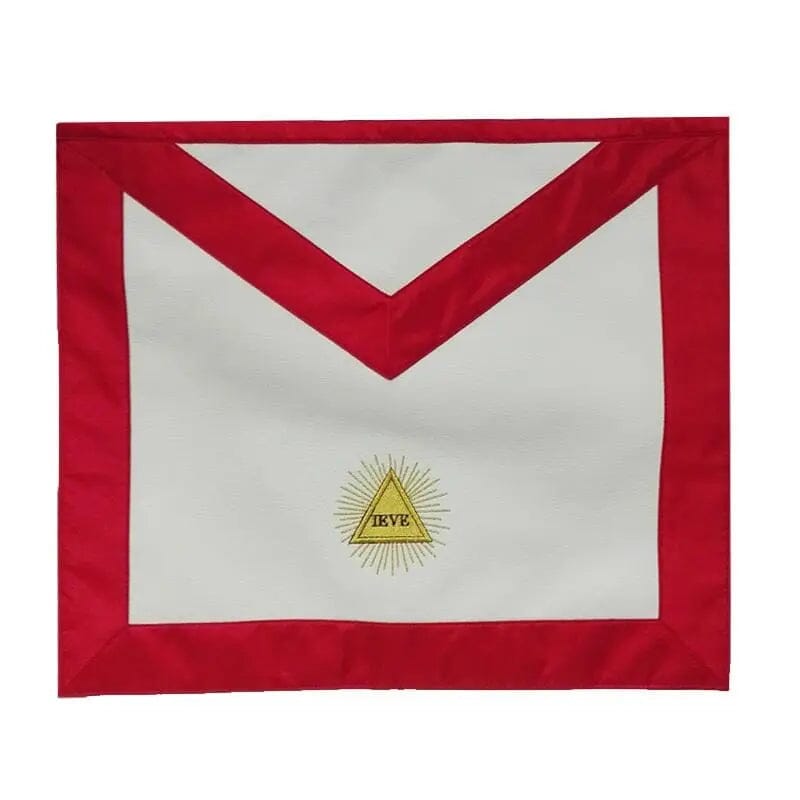 Magnífico delantal masónico bordado a mano rojo, bordeado y duplicado con negro. Está decorado con un delta radiante con el Carta hebrea yod, En El alfabeto samaritano Usado por Albert Pike.