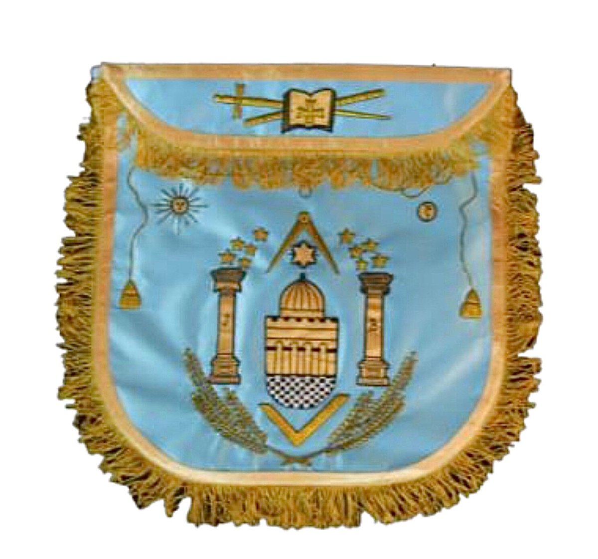 Delantal de ceremonia masónico de Gran Maestre Provincial en seda natural azul cielo, ribeteado con una fina cinta dorada y flecos dorados. Está bordado a mano.
