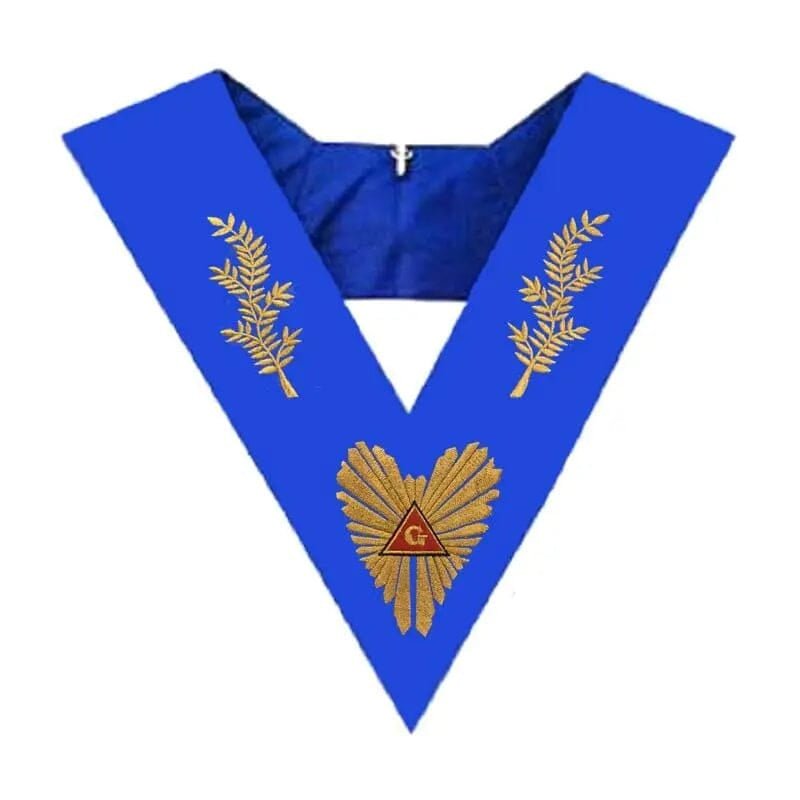 Impresionante Collar del maestro venerable en seda natural vistoso azul exterior, decorado con un Delta irradiando con la carta GRAMO y ramas acacia Gold bordado en un acabado de alto nivel. EL Atrás se duplica Para una mejor comodidad.