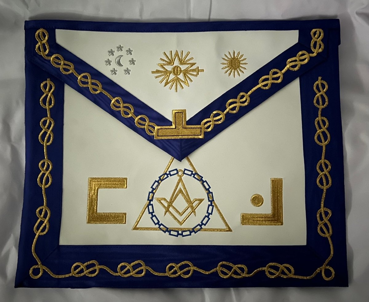 Ce magnifique tablier de Maître Installé franc-maçon est brodé à la main. Il est décoré de 7 broderies et d’un Tau inversé.