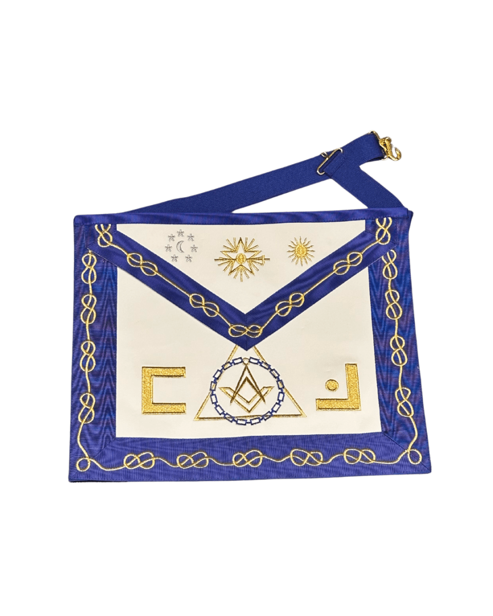 Questo magnifico maestro di maestro master è ricamato a mano. È decorato con 6 ricami: il sole e la luna, la stella sgargiante con la lettera g, sulla quale sono disegnate un filo di piombo che attraversa una linea orizzontale, la piazza e la bussola circondate da una catena di unione e poste su un equilaterale Triangolo d'oro, le lettere M:. e b:. In alfabeto massonico e laghi d'amore.