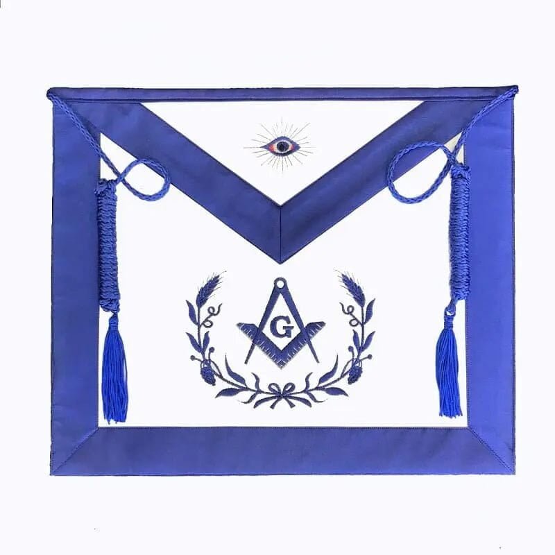 Questo Magnifico grembiule massonico, ricamato a mano e delimitato da Blu all'estero, è decorato con occhio E daquadrato e bussola Con il Lettera G, circondato da allori.