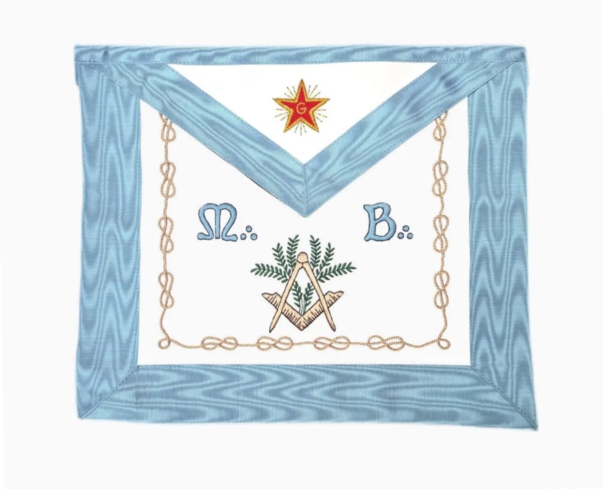 Questo Magnifico grembiule massonico Di Maestro è ricamato a mano, decorato con a confine In nastro blu cielo e ricami fatti a mano. È adornato con ilStar sgargiante con la lettera G, Di Amo i laghi, del Lettere m.b. e delQuadrato e bussola.