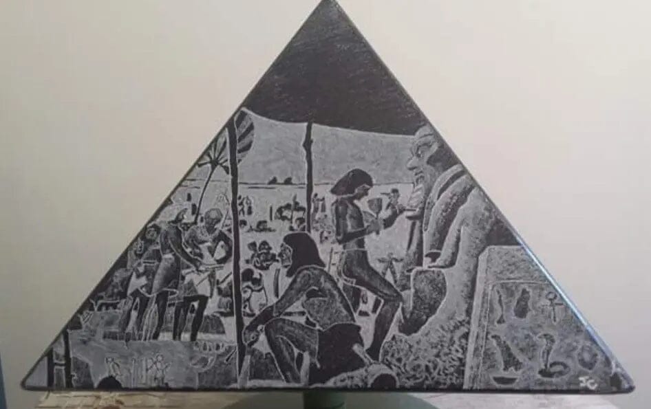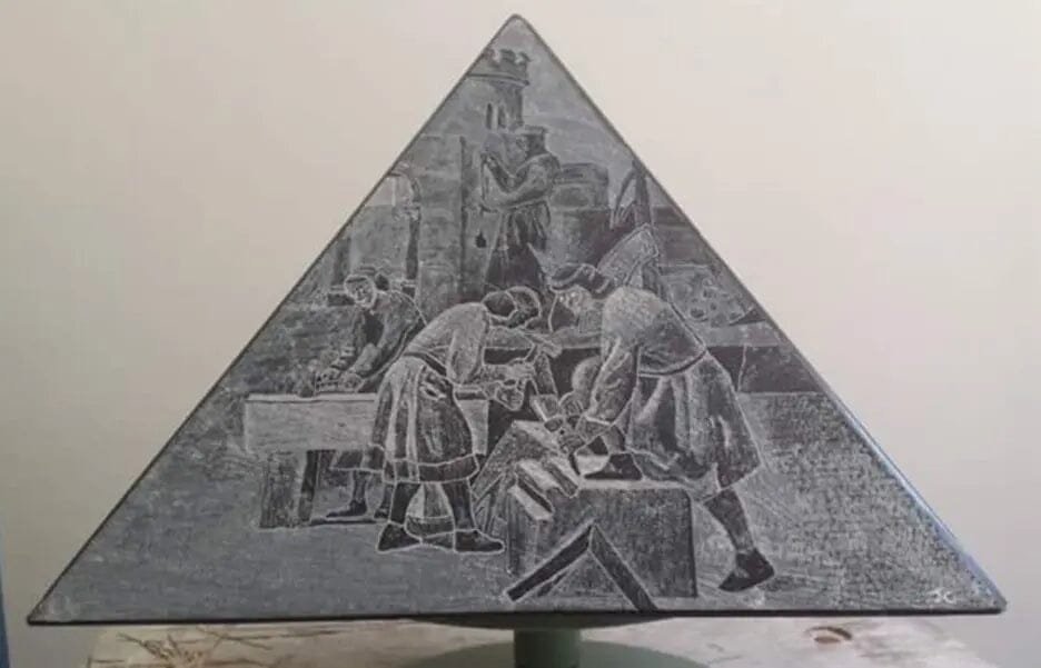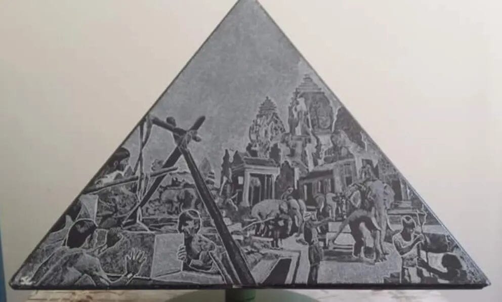 - Una scultura piramide a 4 facce con incisioni "le dimensioni della pietra in diverse epoche"