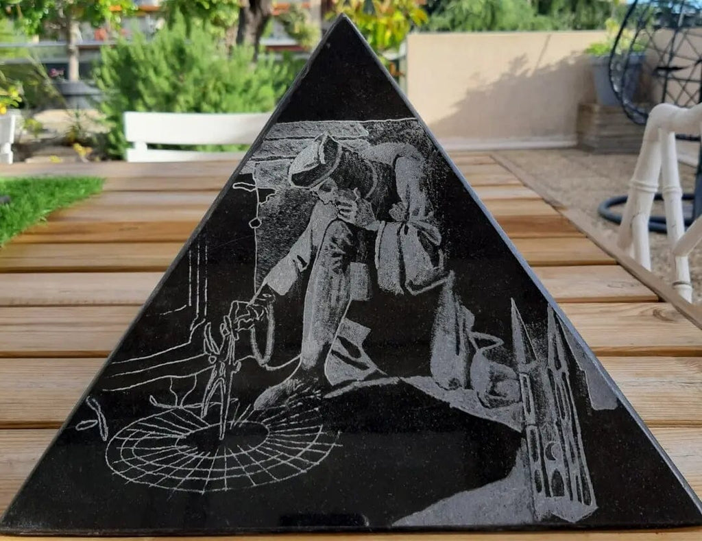 Scultura piramide da 4 facce con incisioni "Le dimensioni della pietra in diverse epoche"