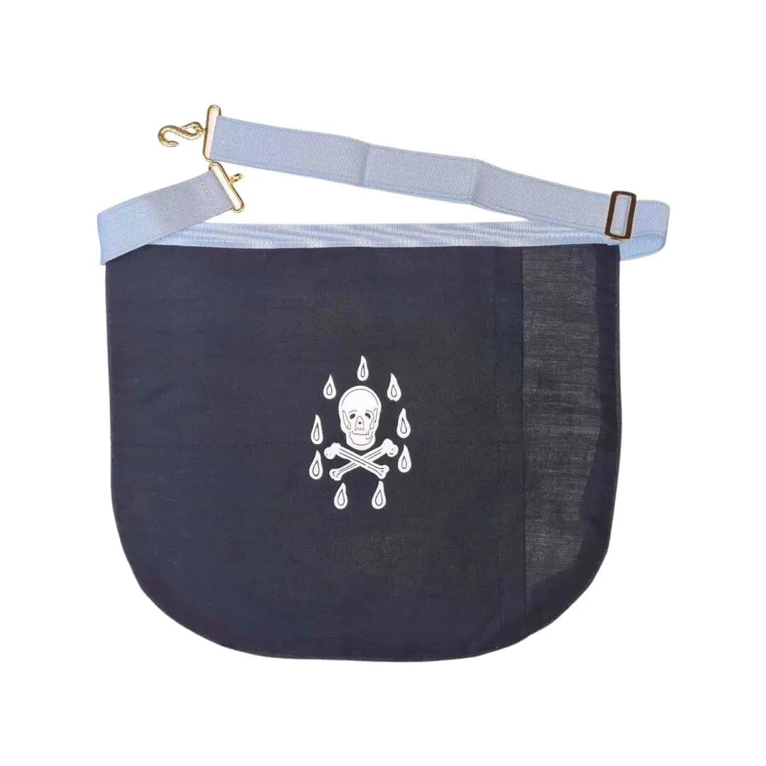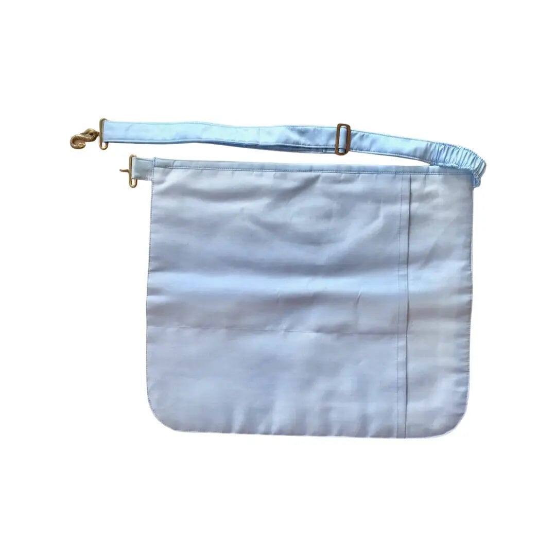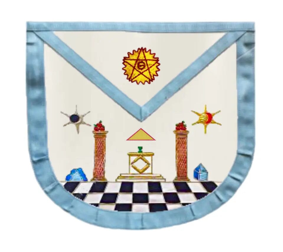 Ce magnifique tablier maçonnique de Maître  est brodé à la main, décoré d'une bordure en ruban bleu ciel et de broderies faites main. Il est orné de l’Étoile Flamboyante avec la lettre G, d’un Pavé Mosaïque, de deux Colonnes, d’un Autel surmonté d’un Delta rouge, de la Pierre Cubique et de la Pierre Brute, ainsi que du Soleil et de la Lune.
