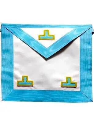 Ce magnifique Tablier de Vénérable Maître brodé à la main est décoré d'une bordure en ruban bleu turquoise et de Trois Taus inversés bordés d’or.