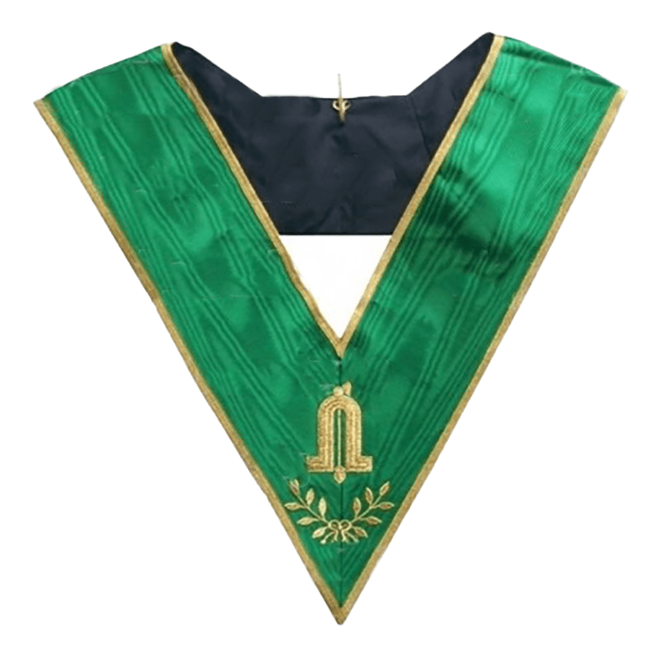 Esplêndido Colar do segundo supervisor em seda natural de verde borda de ouro e decorado com O emblema da função bordada em ouro Em um Acabamento alto. As costas negras são dobro Para melhor conforto, com um funeral.