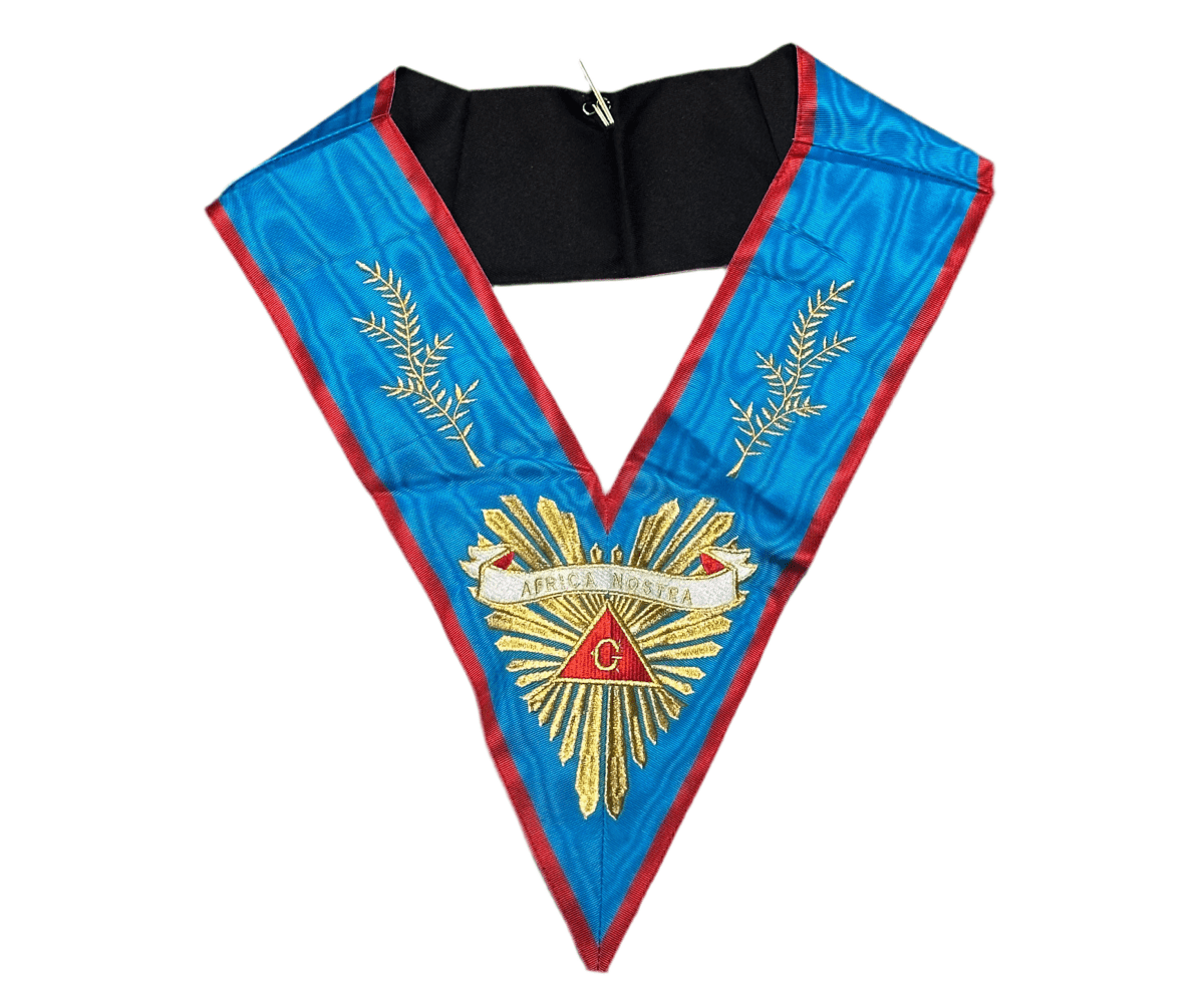 Soberbo colar longo de venerável mestre ou venerável mestre do homem personalizável em azul turquesa colorido com vermelho, decorado com um delta radiante com a letra G e grandes galhos de acácia bordados em ouro em um acabamento alto.