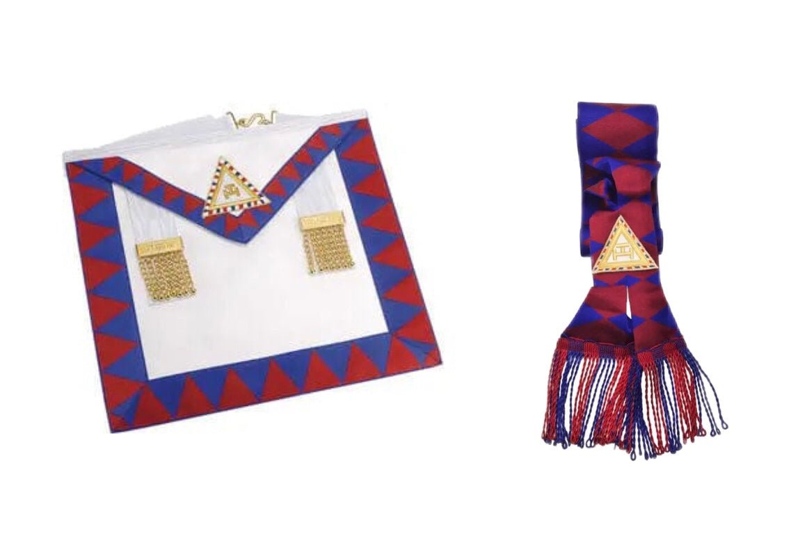 Este magnífico avental maçônico bordado à mão é decorado com o triângulo com o Tau Triple e dois pingentes de cor dourada.